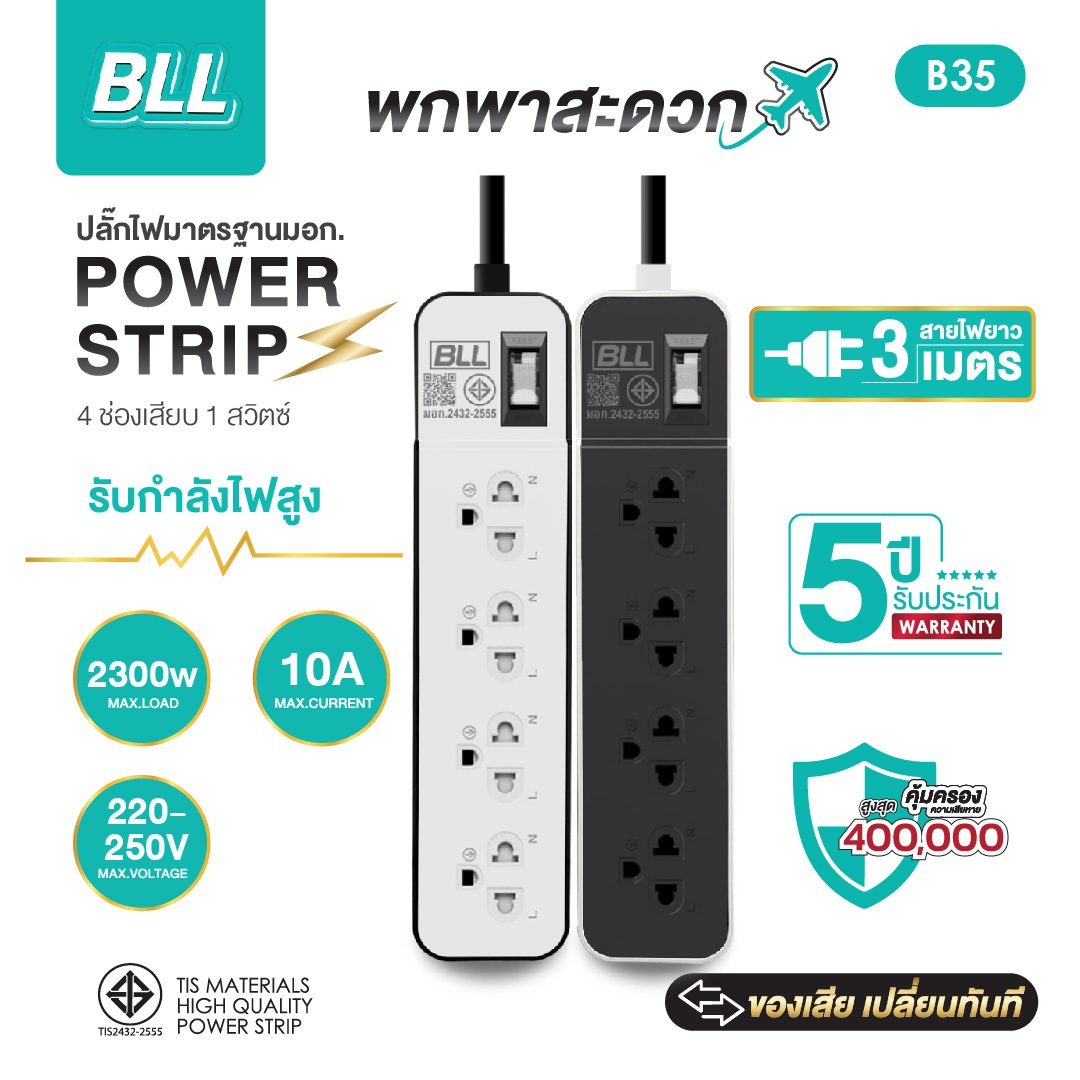 ปลั๊กไฟคุณภาพ BLL B35ที่มีคุณสมบัติตัดไฟพร้อมถ้าเกิดอุบัติเหตุจากปลั๊กไฟ BLL จะได้รับความคุ้มครองสูงถึง 50,000 บาท รับประกัน 3 ปี