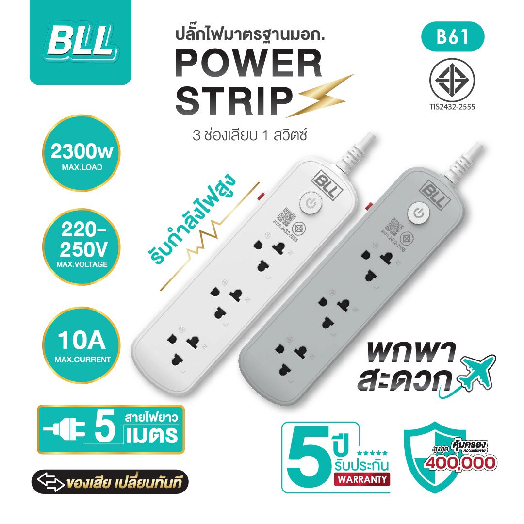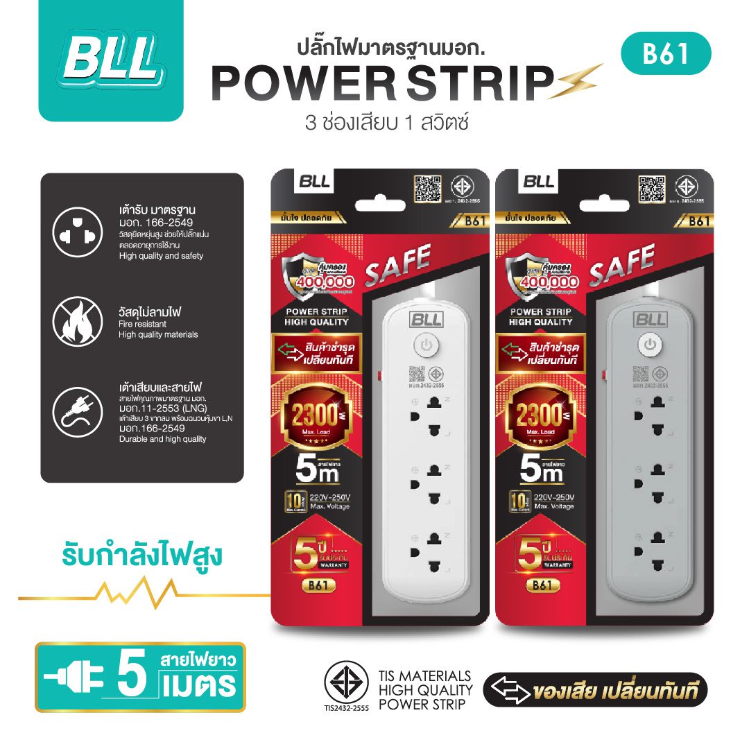 ปลั๊กไฟคุณภาพ มอก.166-2549. BLL B61 ที่มีคุณสมบัติตัดไฟพร้อมถ้าเกิดอุบัติเหตุจากปลั๊กไฟ BLL จะได้รับความคุ้มครองสูงถึง 400,000 บาท รับประกัน 5 ปี