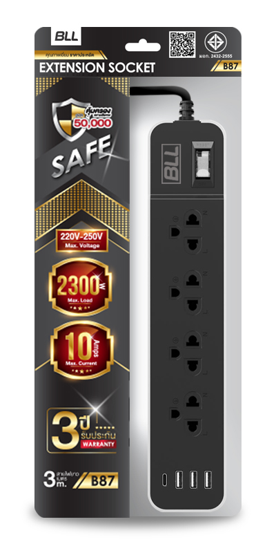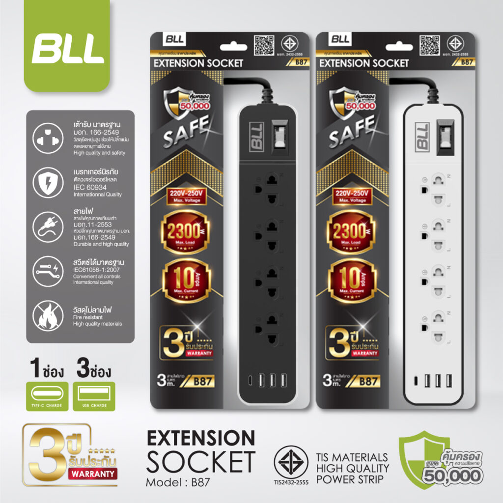 + Free Shippingปลั๊กไฟคุณภาพ BLL B87 ที่มีคุณสมบัติตัดไฟพร้อมถ้าเกิดอุบัติเหตุจากปลั๊กไฟ BLL จะได้รับความคุ้มครองสูงถึง 50,000 บาท รับประกัน 3 ปี