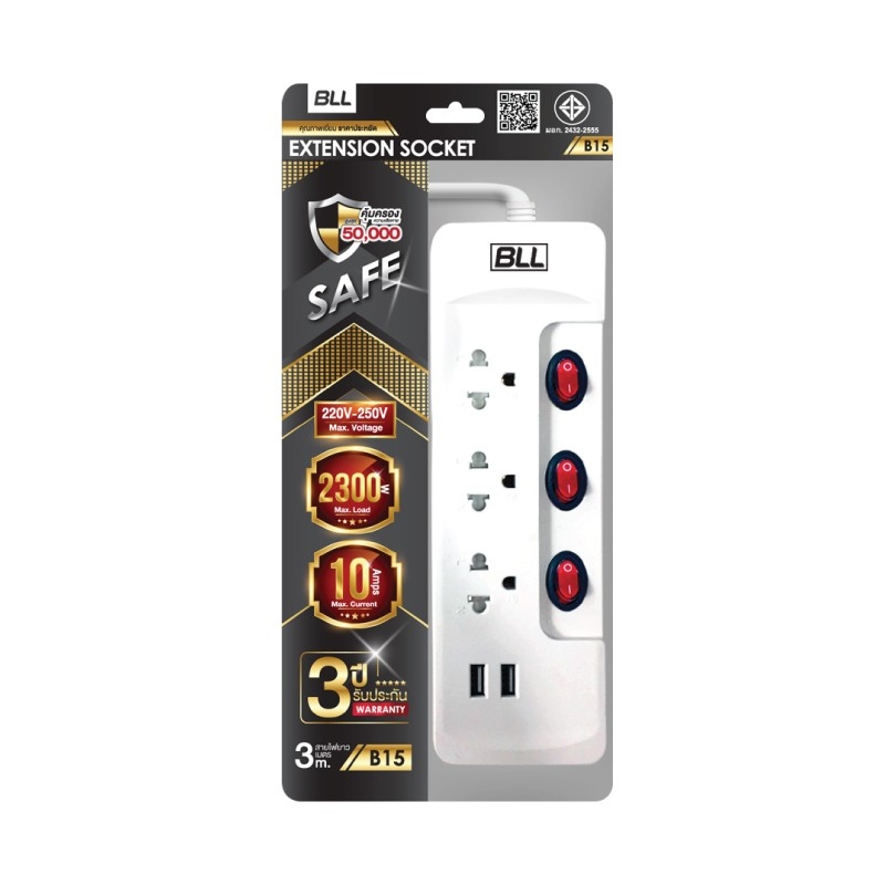 + Free Shippingปลั๊กไฟคุณภาพ BLL B15 ที่มีคุณสมบัติตัดไฟพร้อมถ้าเกิดอุบัติเหตุจากปลั๊กไฟ BLL จะได้รับความคุ้มครองสูงถึง 50,000 บาท รับประกัน 3 ปี