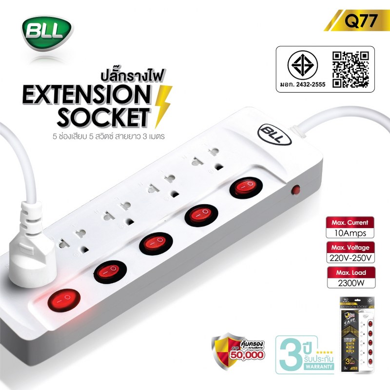 - ปลั๊กไฟคุณภาพ BLL Q77 ที่มีคุณสมบัติตัดไฟพร้อมถ้าเกิดอุบัติเหตุจากปลั๊กไฟ BLL จะได้รับความคุ้มครองสูงถึง 50,000 บาท กับคุณสมบัติ