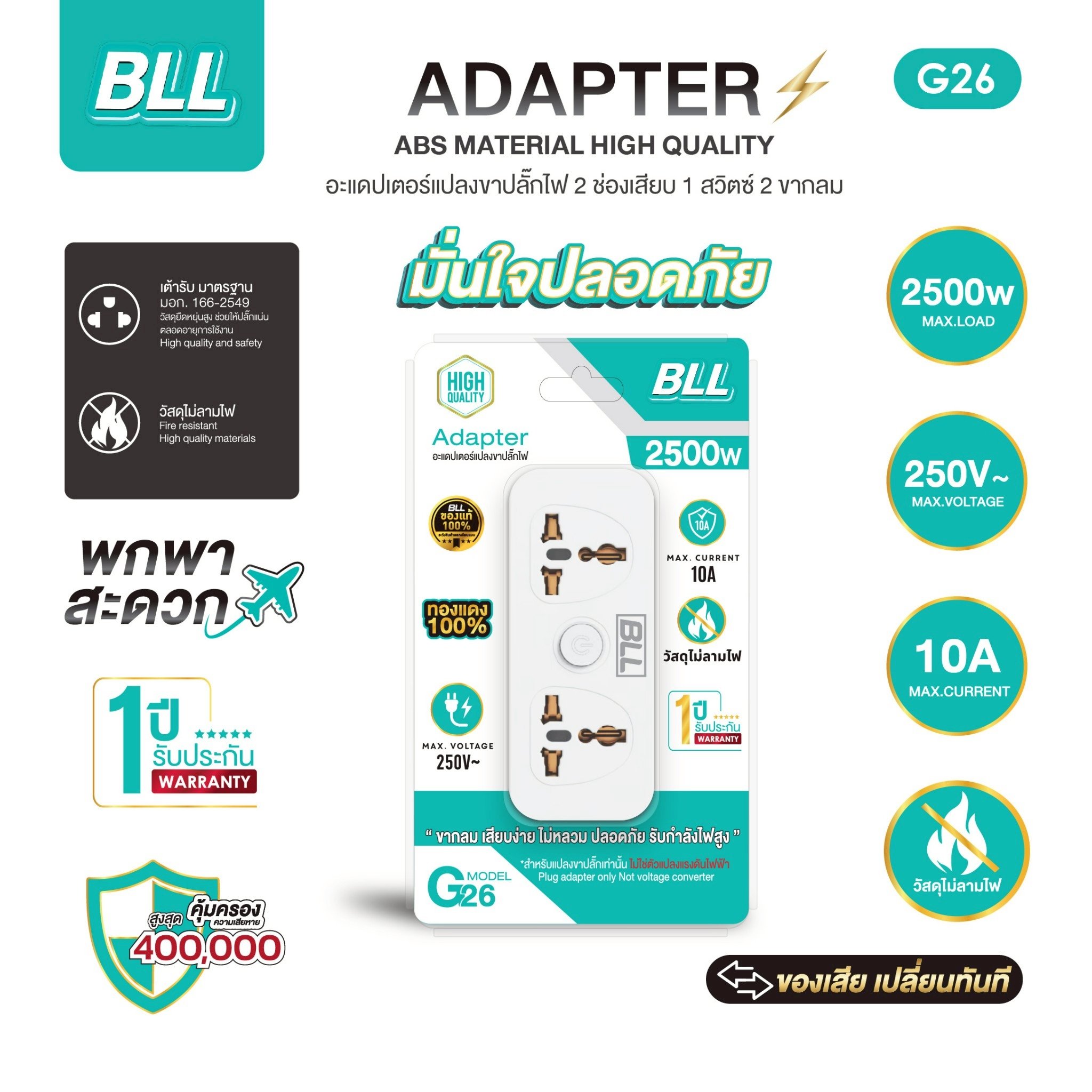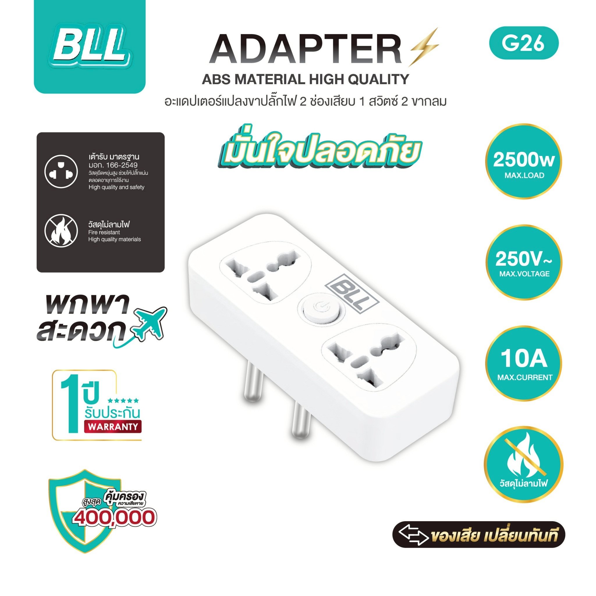 BLL G26 Adapter แปลง 2 ขากลม 2 ช่องเสียบ 1 สวิตซ์
