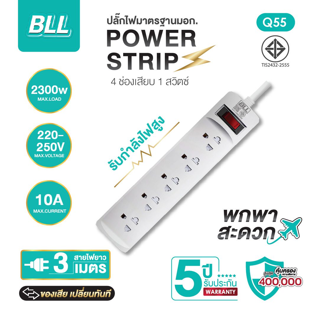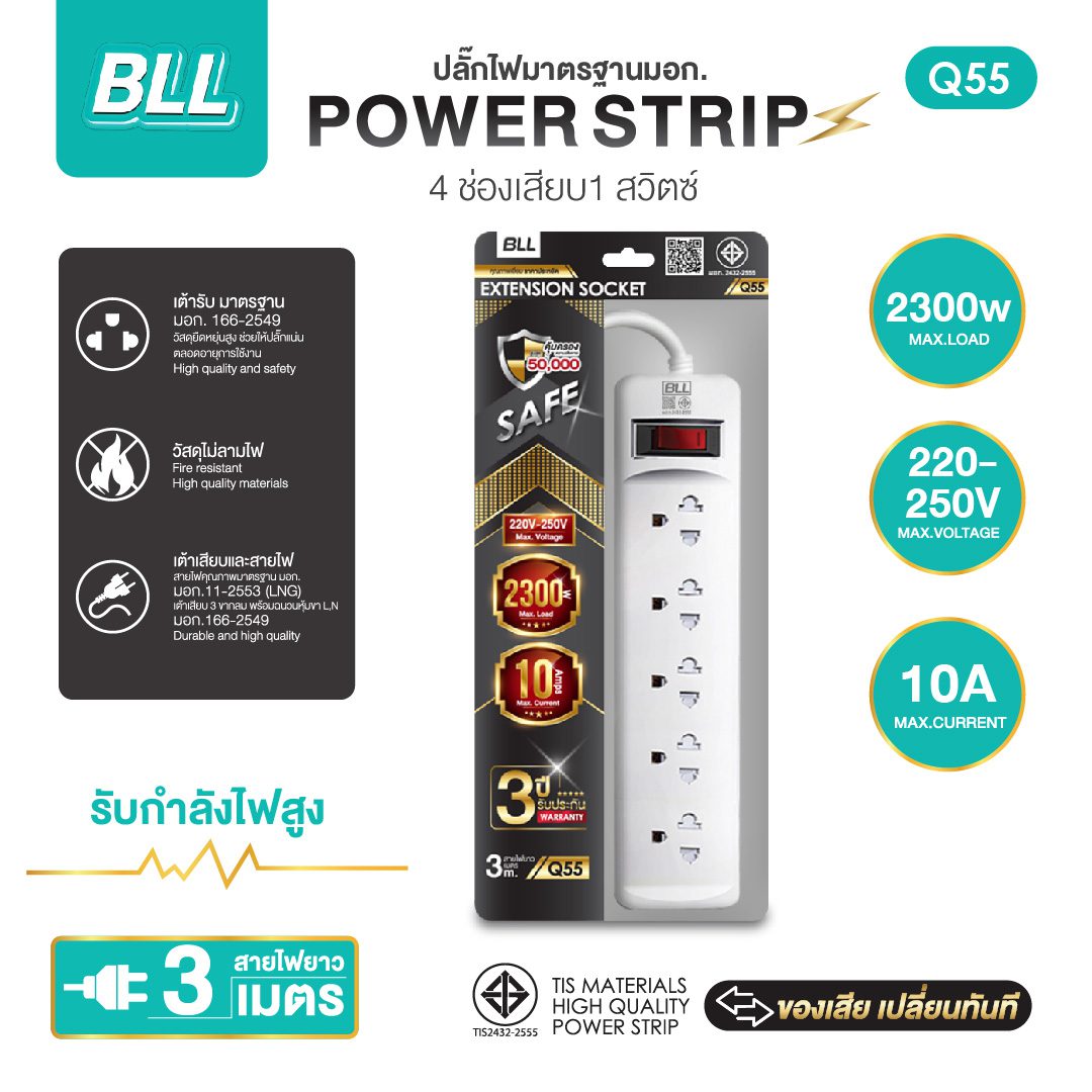 - ปลั๊กไฟคุณภาพ BLL Q55 ที่มีคุณสมบัติตัดไฟพร้อมถ้าเกิดอุบัติเหตุจากปลั๊กไฟ BLL จะได้รับความคุ้มครองสูงถึง 50,000 บาท กับคุณสมบัติ