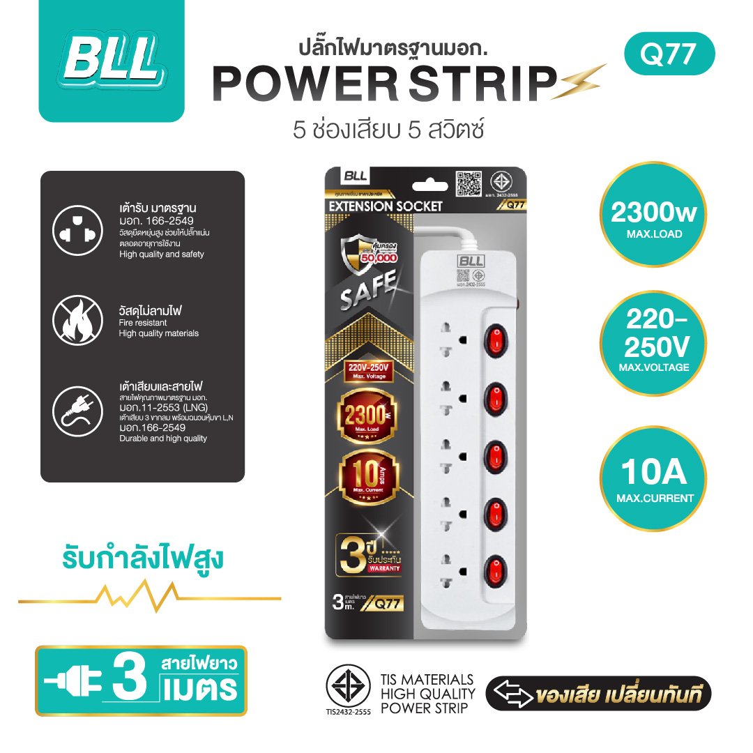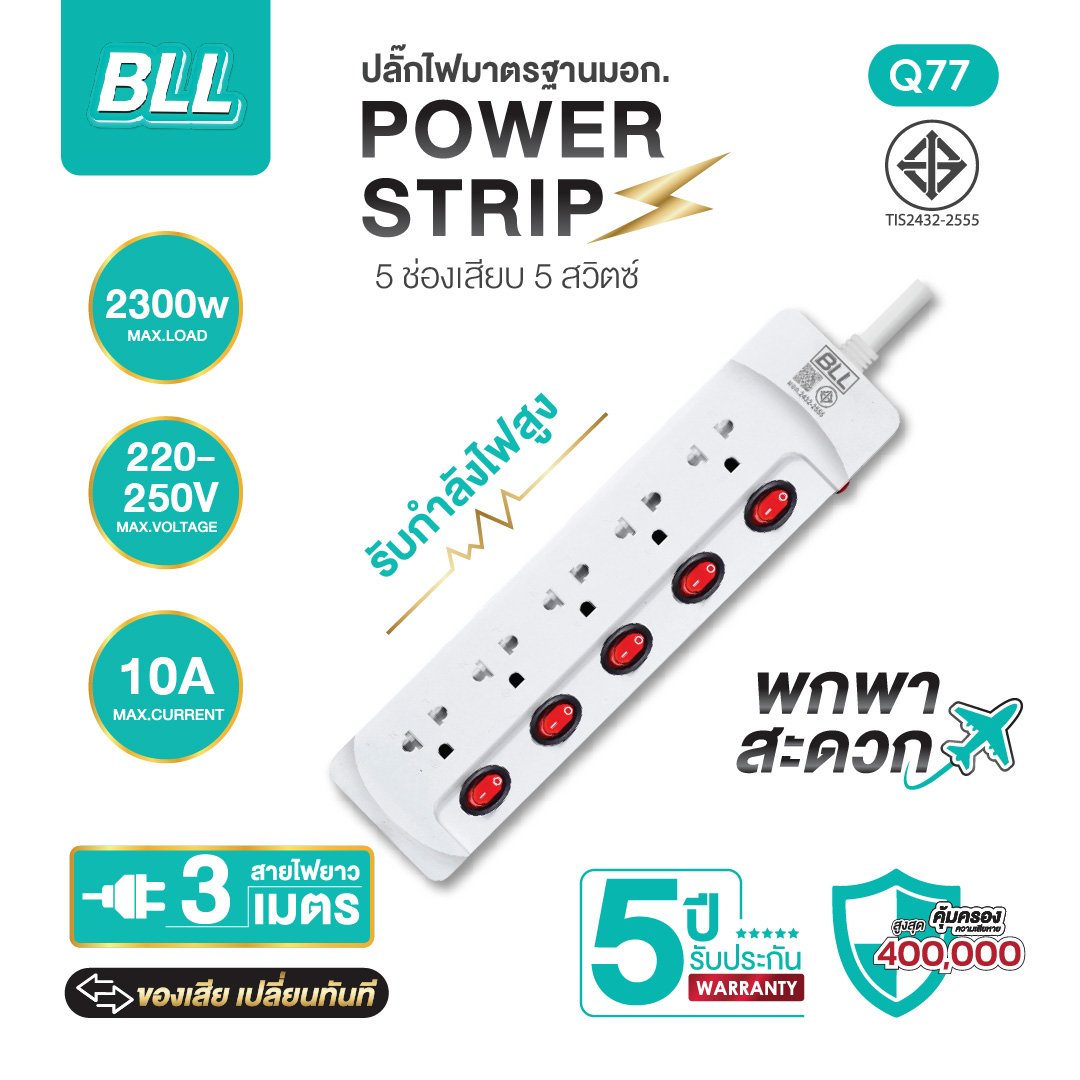 - ปลั๊กไฟคุณภาพ BLL Q77 ที่มีคุณสมบัติตัดไฟพร้อมถ้าเกิดอุบัติเหตุจากปลั๊กไฟ BLL จะได้รับความคุ้มครองสูงถึง 50,000 บาท กับคุณสมบัติ